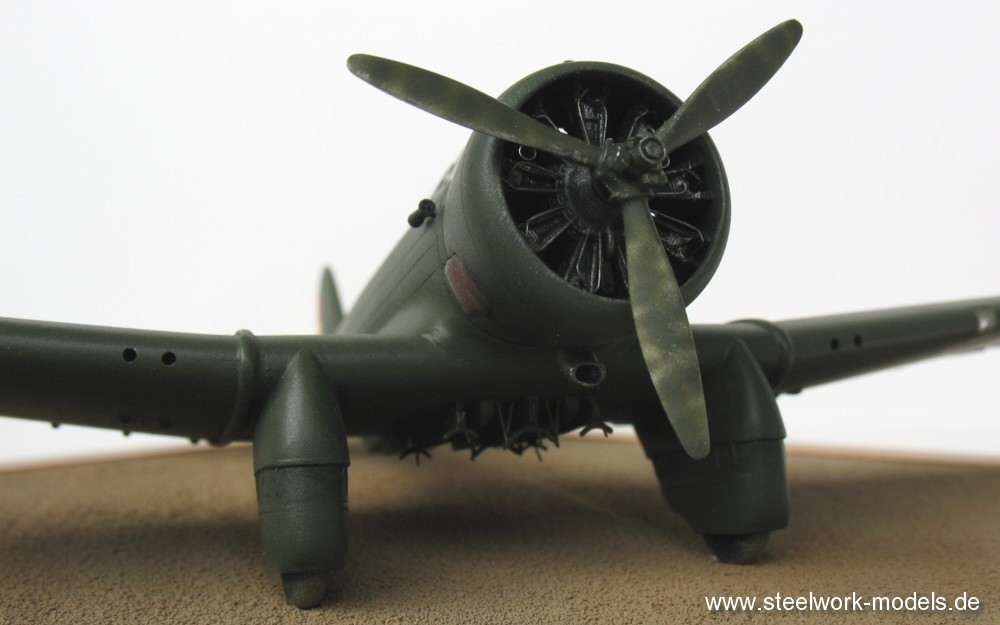 Der Motor des AZUR-Bausatzes war mir zu wuchtig. Daher verwendete ich einen Motor aus einem Delta-Bausatz von AZUR. Lufthutzen und Auspuffanlage stammen aus dem RS-Bausatz und wurden entsprechend angepasst. Der Propeller entstand aus verschiedenen Teilen meiner Ersatzteilsammlung.