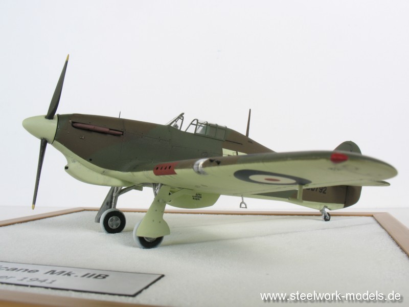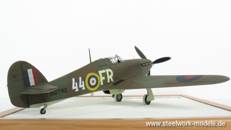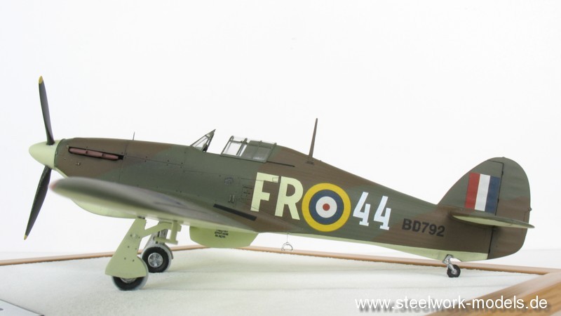 Weiterhin bekam die Hurricane eine selbstgezoge Kabinenhaube, neue Landescheinwerfer und den markanten Rückspiegel auf der Kabine spendiert. Für die Farbgebung verwendete ich Farben aus dem Sortiment von VALLEJO AIR. Die Decals stammen aus dem HASEGAWA-Bausatz. Die spezielle Kennung vom AML-Bogen 72009. Das "FR" mit selbst lackierten Sky-Farbton.