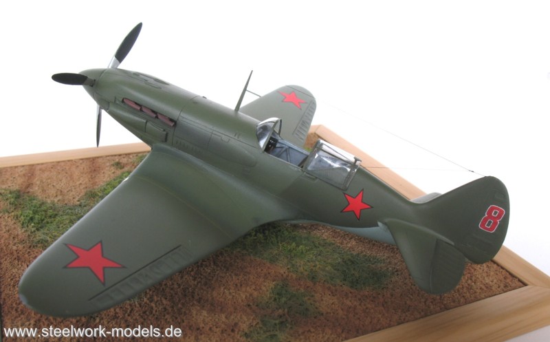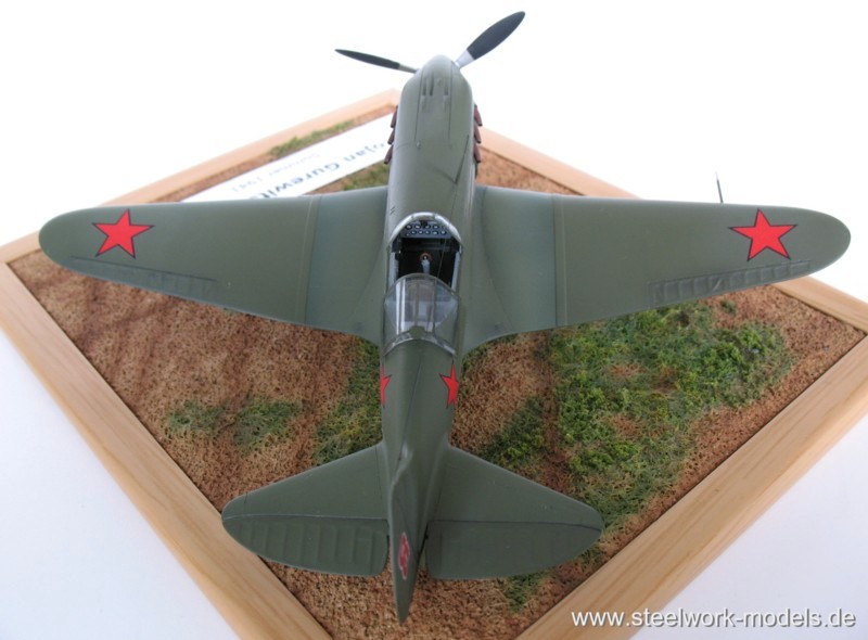 Für die Lackierung verwendete ich erstmals Acryl-Farben von VALLEJO. Die Decals entstammen der Krabbelkiste. Die von mir dargestellte MiG dürfte nicht im Kampf-Einsatz gestanden haben. Sie fiel den vorrückenden deutschen Truppen mehr oder weniger intakt in die Hände.