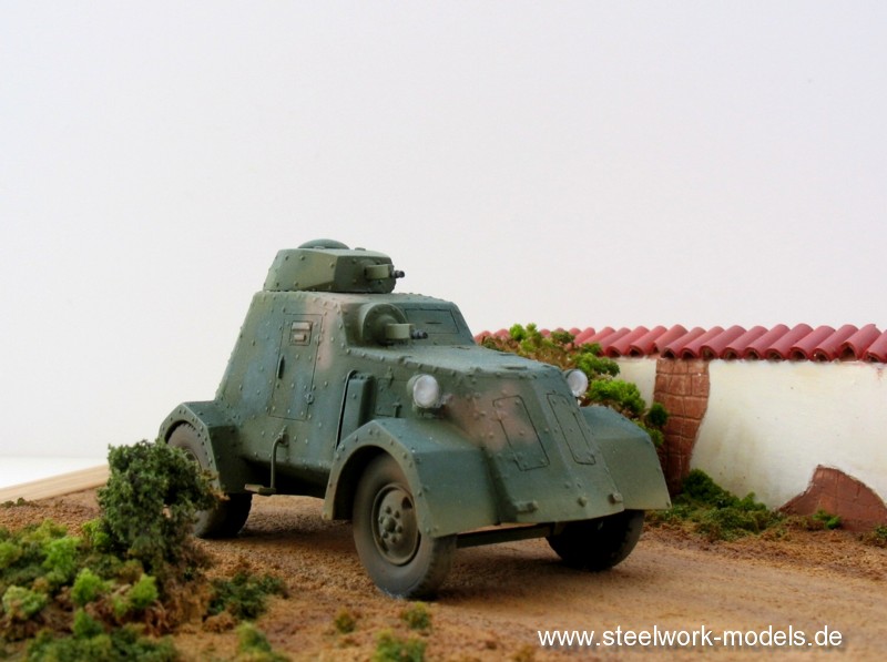 Da der UNL-35 Panzerwagen ein recht schnittiges Fahrzeug war, hat er mich schon immer interessiert. Leider gab es keinen Bausatz, so habe ich dieses Fahrzeug selbst gebaut, was aber auf Grund der komplizierten Formen eine aufwendige Arbeit war. Mein Modell ist direkt aus dem Bausatz gebaut. Das anpassen der Kotflügel an die Panzerwanne erfordert hier und da etwas Spachtel. Für die Scheinwerfer gab es wieder gezogen Gläser.