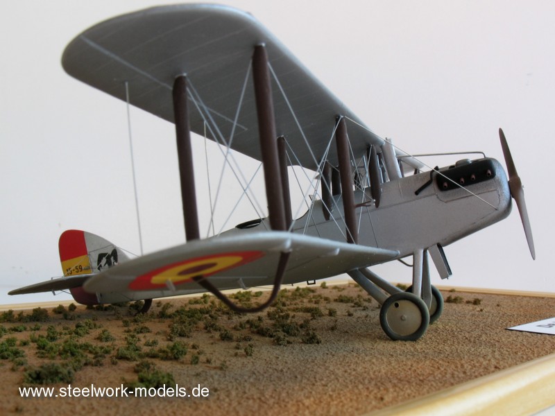 Die Bemalung erfolgte mit Farben von HUMBROL. Die Kennungen wurden aus Decalfilm und Abreibe-Zahlen erstellt. Das Emblem der Grupo 23 in Logrono, ein Rabe, habe ich selbst erstellt und entsprechend drucken lassen. Im Sommer 1936 war diese Maschine als Schulflugzeug im Einsatz. Nach Ausbruch des Bürgerkrieges erfolgte der Einsatz auch als Kampfflugzeug.