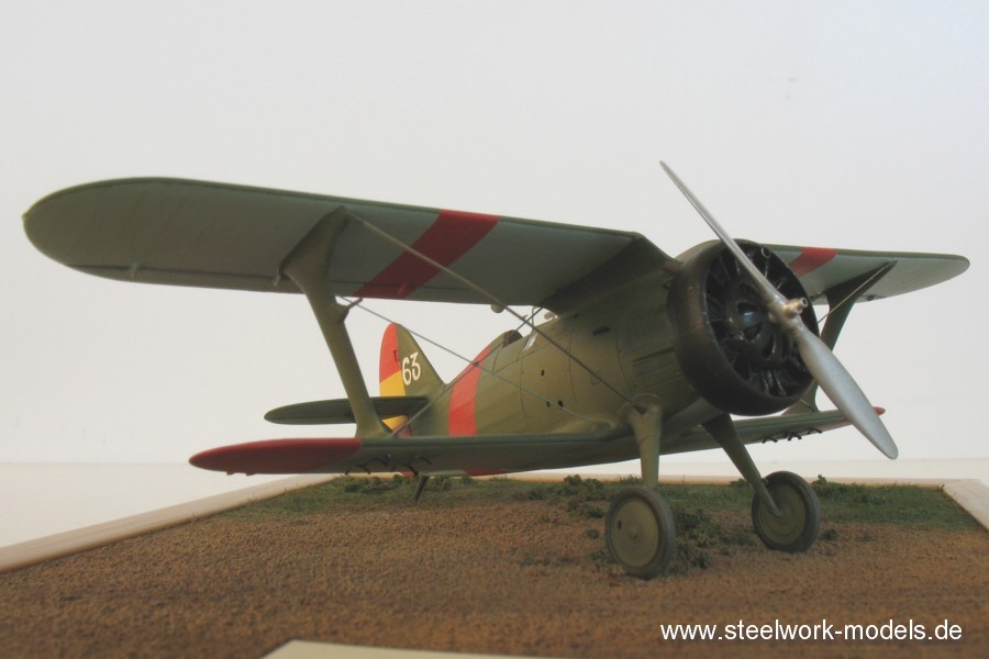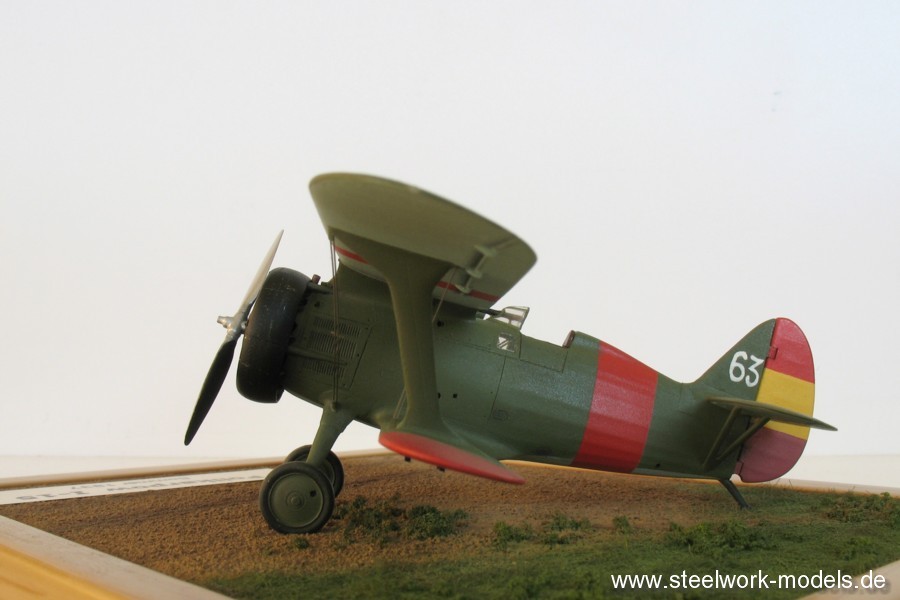 Die Farbgebung erfolgte damals noch mit Farben von HUMBROL. Den Triebwerksbereich habe ich später dann noch schwarz bemalt, da eigentlich alle Maschinen dies so hatten. Die Maschine besitzt leicht unsymetrisch angebrachte rote Streifen, die eher in der Mitte der oberen Tragflächen angebracht sind. Bei I-15-Jägern gab es das recht selten in Spanien. Die weiße 63 habe ich mit Hand auf Trägerfilm gemalt und dann als Abziehbild aufgebracht.